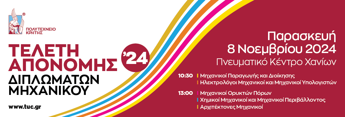 Η Τελετή Απονομής Διπλωμάτων Μηχανικού του Πολυτεχνείου Κρήτης για την ανακήρυξη της επαναληπτικής εξεταστικής του ακαδημαϊκού έτους 2023-2024, θα πραγματοποιηθεί στο Πνευματικό Κέντρο Χανίων την Παρασκευή 08 Νοεμβρίου 2024 και ώρα:
