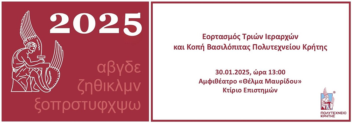 Η Πρυτανεία του Πολυτεχνείου Κρήτης σας προσκαλεί στην εκδήλωση για τον Εορτασμό των Τριών Ιεραρχών, της επίσημης ημέρας των γραμμάτων και της παιδείας, και την Ετήσια Κοπή της Βασιλόπιτας του Ιδρύματος, που θα πραγματοποιηθεί την Πέμπτη 30 Ιανουαρίου 2025 και ώρα 13:00, στο Αμφιθέατρο «Θέλμα Μαυρίδου» του Κτιρίου Επιστημών.