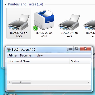 Να επιλέξετε από το κεντρικό μενού των Windows τις επιλογές Start/Devices and Printers ή από το εικονίδιο του εκτυπωτή κάτω αριστερά στην μπάρα εργασίας Taskbar και από τη λίστα με τους εκτυπωτές του Μηχανογραφικού Κέντρου που θα εμφανιστούν να κάνετε διπλό κλικ στον εκτυπωτή όπου στείλατε εντολή εκτύπωσης, όπως φαίνεται στο παρακάτω Σχήμα.