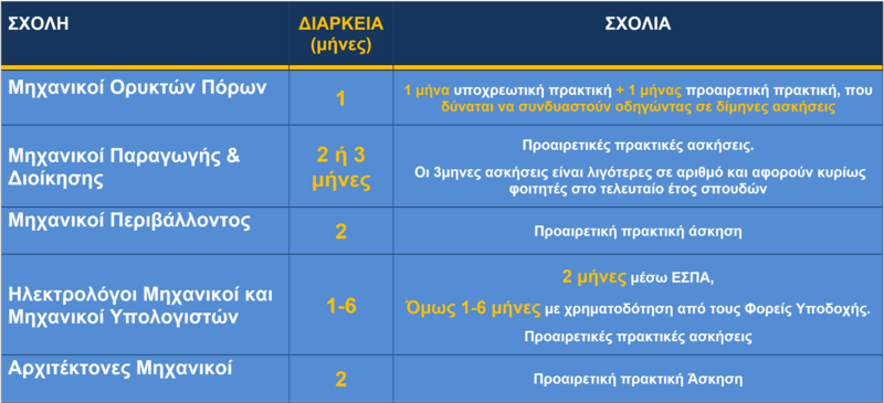 Ειδικά, η Σχολή Ηλεκτρολόγων Μηχανικών και Μηχανικών Υπολογιστών, για την παρακολούθηση της υλοποίησης της πρακτικής έχει καταρτιστεί ειδική φόρμα με το συμφωνημένο πλάνο απασχόλησης του φοιτητή, ενώ προβλέπεται και Μηνιαία Έκθεση Πεπραγμένων για τον έλεγχο της προόδου υλοποίσης της άσκησης και την προώθηση της αποζημίωσης του φοιτητή ανά μήνα. Στο τέλος, συντάσσεται η Τελική Έκθεση Πεπραγμένων.