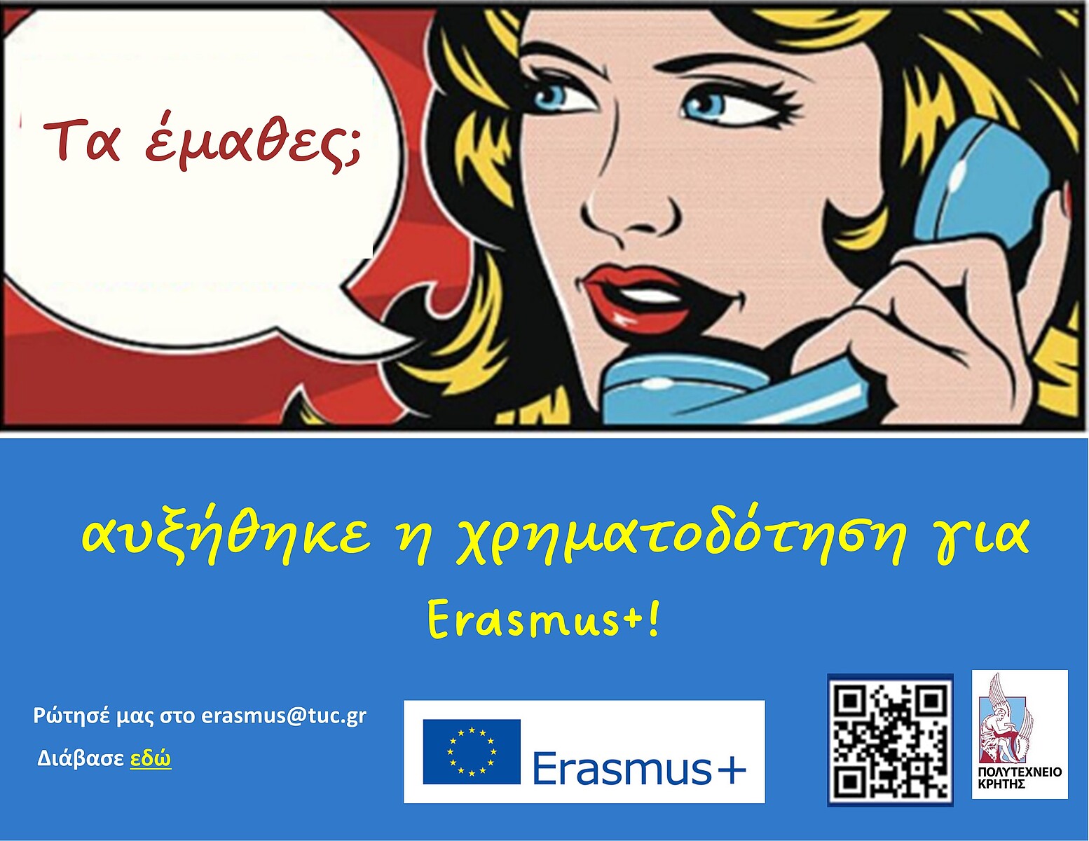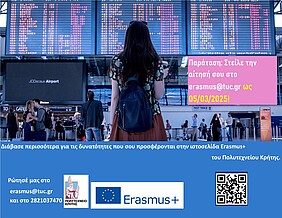 Οι φοιτητές / φοιτήτριες του Πολυτεχνείου Κρήτης, οι οποίοι/-ες επιθυμούν να συμμετάσχουν στο πρόγραμμα κινητικότητας Erasmus+ προκειμένου να πραγματοποιήσουν σπουδές κατά το χειμερινό εξάμηνο ακαδημαϊκού έτους 2025-2026 σε ευρωπαϊκό συνεργαζόμενο Ίδρυμα, μπορούν να υποβάλλουν ηλεκτρονικά την αίτησή τους συνοδευόμενη από τα απαιτούμενα δικαιολογητικά στο erasmus@tuc.gr έως και την Τετάρτη 05/03/2025.