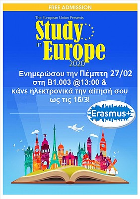 ΕΝΗΜΕΡΩΘΕΙΤΕ ΓΙΑ ΤΙΣ ΔΥΝΑΤΟΤΗΤΕΣ ΤΟΥ ΠΡΟΓΡΑΜΜΑΤΟΣ ERASMUS+ ΑΥΡΙΟ ΠΕΜΠΤΗ 27/02/2020 ΩΡΑ 13:00 ΑΙΘΟΥΣΑ Β1.003