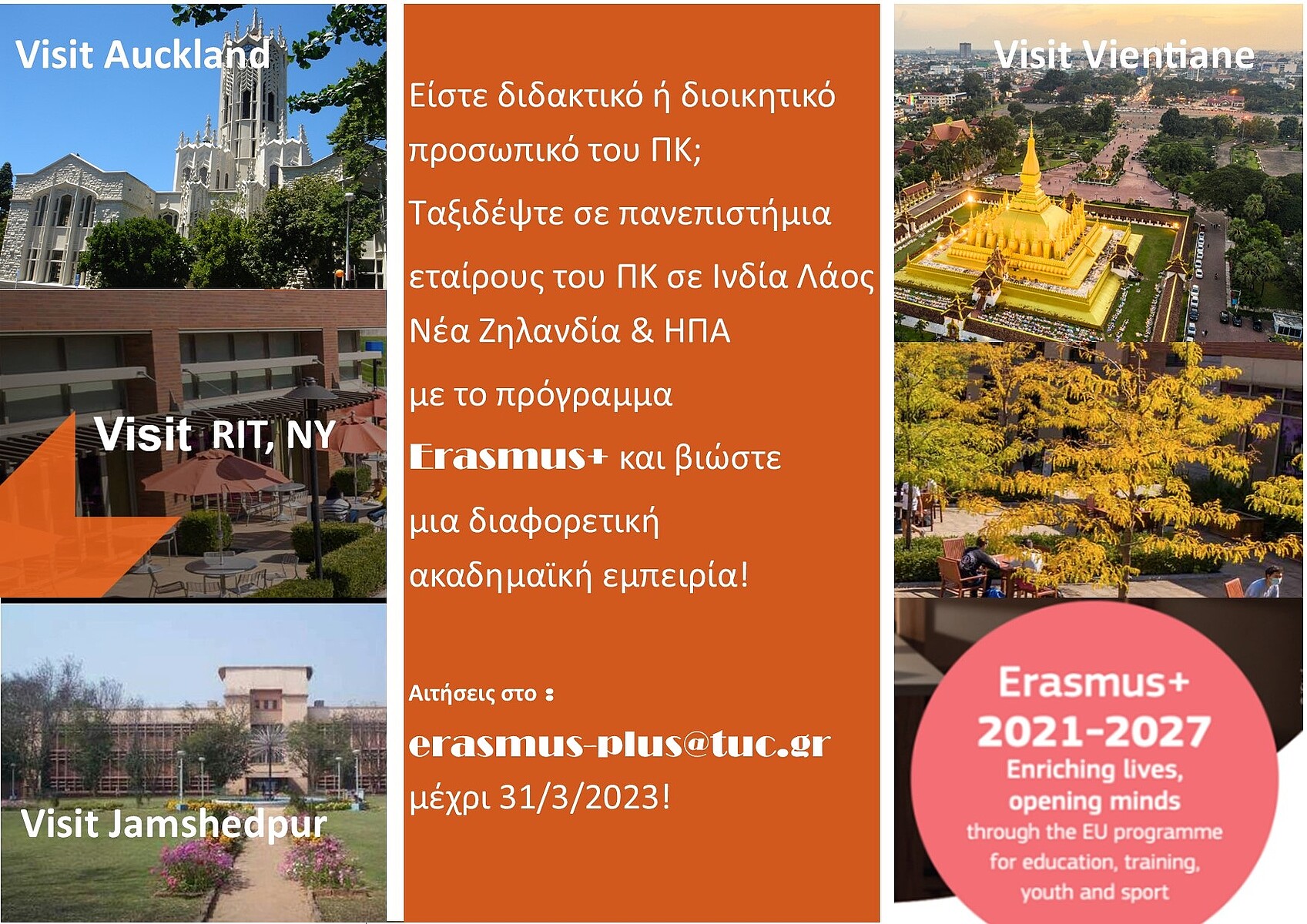 Θα γίνουν δεκτές αιτήσεις τόσο για διδασκαλία όσο και για επιμόρφωση, με προτεραιότητα στην υλοποίηση του Σχεδίου όπως αυτό έχει ήδη αρχικά εγκριθεί. Σε περίπτωση που οι διαθέσιμες θέσεις δεν καλυφθούν από ενδιαφερόμενους για κινητικότητα με σκοπό την διδασκαλία, οι θέσεις θα παραχωρηθούν αυτόματα σε ενδιαφερόμενους για κινητικότητα για επιμόρφωση, σύμφωνα με τις οδηγίες του προγράμματος. Επιπλέον θέσεις δύνανται να υπάρξουν για το προσωπικό του Πολυτεχνείου Κρήτης, εφόσον οι εταίροι μας δεν υλοποιήσουν τις δικές τους εγκεκριμένες κινητικότητες, σύμφωνα με τις οδηγίες του προγράμματος αλλά και τους διαχειριστικούς περιορισμούς που προβλέπονται για τέτοιου είδους αλλαγές. Καλείται το Διδακτικό/Διοικητικό Προσωπικό (ΔΕΠ, ΕΕΠ, ΕΔΙΠ, ΕΤΕΠ, Διοικητικό Προσωπικό: μόνιμοι, ΙΔΑΧ,ΙΔΟΧ), οι οποίοι επιθυμούν να πραγματοποιήσουν περίοδο διδασκαλίας ή επιμόρφωσης στους Εταίρους του Πολυτεχνείου Κρήτης στο πλαίσιο της Διεθνούς Κινητικότητας να υποβάλλουν ηλεκτρονικά την αίτησή τους και τα απαιτούμενα δικαιολογητικά στο erasmus-plus@tuc.gr (υπόψιν κας Παπαδογεωργάκη/ κου Μαραγκουδάκη) από την Πέμπτη 23 Μαρτίου 2022 μέχρι και την Παρασκευή 31 Μαρτίου 2023.