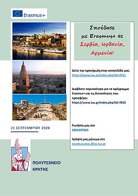 Οι φοιτητές / φοιτήτριες του Πολυτεχνείου Κρήτης που επιθυμούν να συμμετέχουν στο πρόγραμμα Διεθνούς Κινητικότητας Erasmus+ προκειμένου να πραγματοποιήσουν σπουδές ή μέρος της διπλωματικής τους εργασίας για 5 μήνες κατά τη διάρκεια του ακαδημαϊκού έτους 2020-2021 (έως και 31/7/2021) στα Παν/μια: