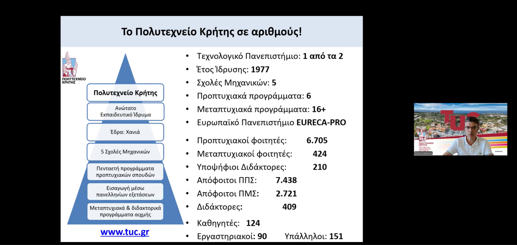 Τους συμμετέχοντες της διαδικτυακής εκδήλωσης καλωσόρισε εκ μέρους της Πρυτανείας του Πολυτεχνείου Κρήτης, ο Αντιπρύτανης Ακαδημαϊκών Υποθέσεων, Διά Βίου Μάθησης και Εξωστρέφειας, Αναπληρωτής Καθηγητής Φώτιος Κανέλλος και στη συνέχεια παρουσίασε γενικές πληροφορίες για το Πολυτεχνείο Κρήτης, τις Σπουδές, την Έρευνα, τις υπηρεσίες και τις υποδομές.