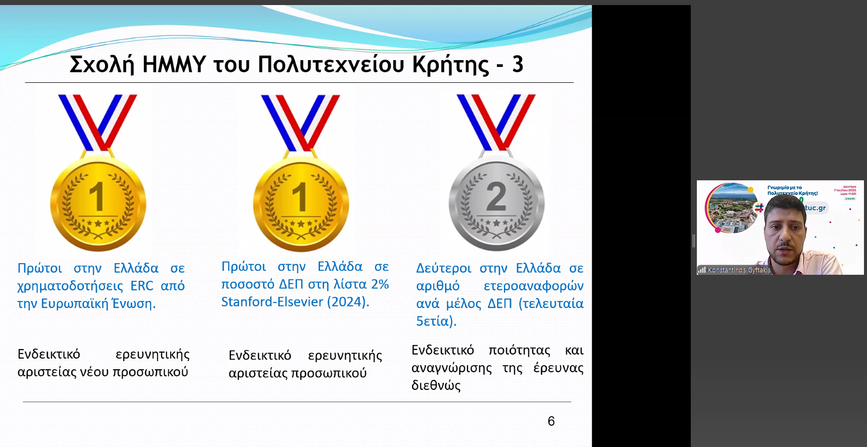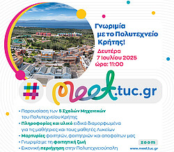 Με ιδιαίτερη επιτυχία ολοκληρώθηκε και φέτος, την Δευτέρα 7 Ιουλίου 2025, η ετήσια Διαδικτυακή Εκδήλωση "Γνωριμία με το Πολυτεχνείο Κρήτης", την οποία διοργάνωσε το Γραφείο Διασύνδεσης και Σταδιοδρομίας στο πλαίσιο των δράσεων του, σε συνεργασία με τις Σχολές του Ιδρύματος.