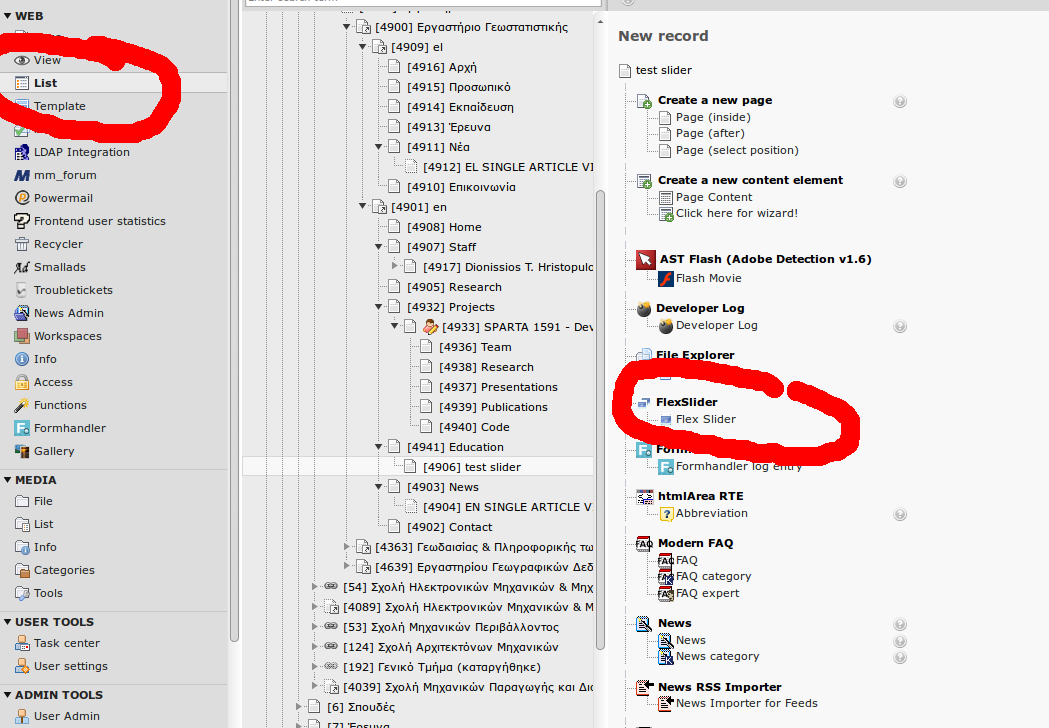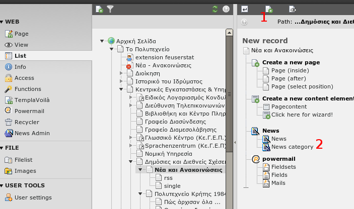 Η προσθήκη των εικόνων γίνεται από την κεντρική επιλογή "List" στο αριστερό μενού του typo3. Αφού πατήσετε το List, επιλέξτε τη σελίδα στην οποία εισάγατε το στοιχείο περιεχομένου. Από την επάνω μπάρα εικονιδίων, επιλέξτε το εικονίδιο