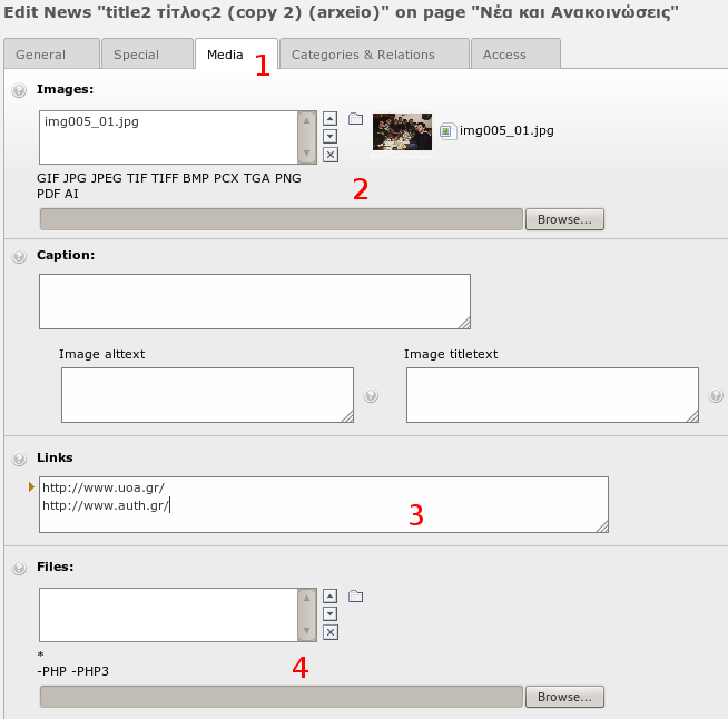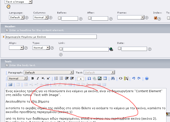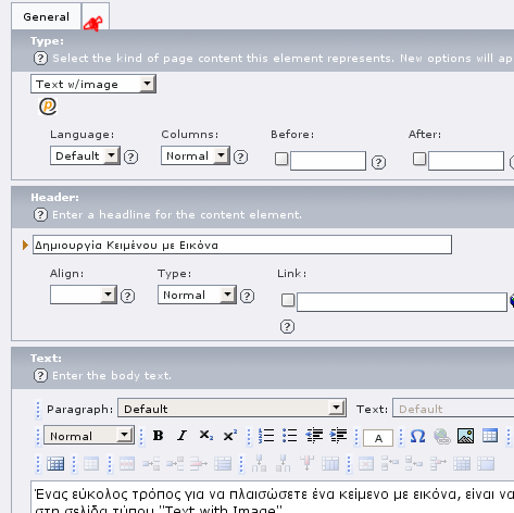Υπάρχει, ακόμα, η δυνατότητα εισαγωγής τίτλου είτε ως μέρος του κειμένου που περιέχεται στη σελίδα (αυτόματος τρόπος) είτε ως τίτλος ενός Content Element (text ή text with image) από το αντίστοιχο πεδίο "Header" στο περιβάλλον σύνθεσης του περιεχομένου του Content Element (μη αυτόματος τρόπος).