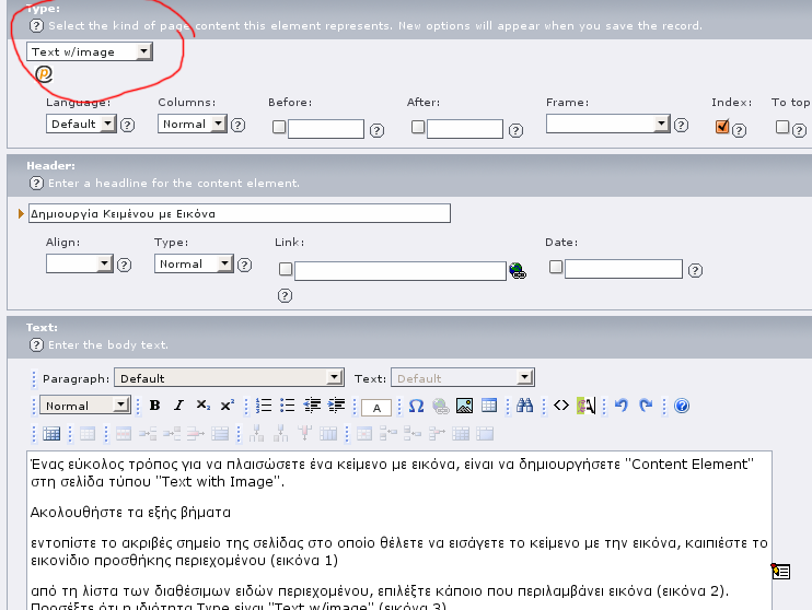 Ένας εύκολος τρόπος για να πλαισιώσετε ένα κείμενο με εικόνα είναι να δημιουργήσετε ένα "Page Content" τύπου "Text with Image ......".