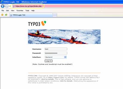 Για να κάνουμε login ανοίγουμε ένα πρόγραμμα πλοήγησης (Internet Explorer, Mozilla Firefox κτλ) και πηγαίνουμε στην εξής διεύθυνση: https://www.tuc.gr/typo3
