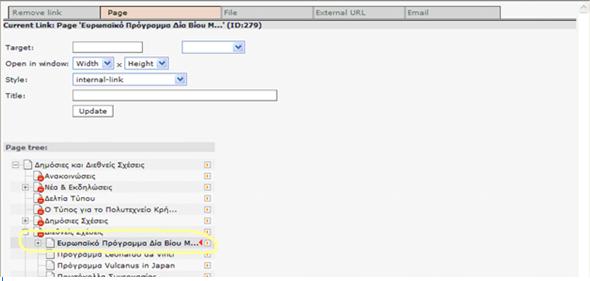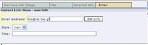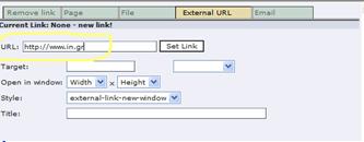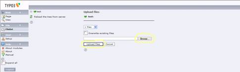 Για να μπορέσουμε να δημιουργήσουμε ένα σύνδεσμο από μια σελίδα σε ένα αρχείο (doc, pdf, excel κτλ) θα πρέπει πρώτα να ανεβάσουμε το αρχείο στον εξυπηρετητή (server). Αυτό γίνεται επιλέγοντας από τον κατάλογο File το Filelist, οπότε στο κυρίως μέρος της οθόνης εμφανίζεται η περιοχή στην οποία έχουμε δικαίωμα να αποθηκεύουμε αρχεία. Κάνουμε δεξί κλικ στον τίτλο της περιοχής (στο παράδειγμα που ακολουθεί είναι η test) και επιλέγουμε το Upload Files