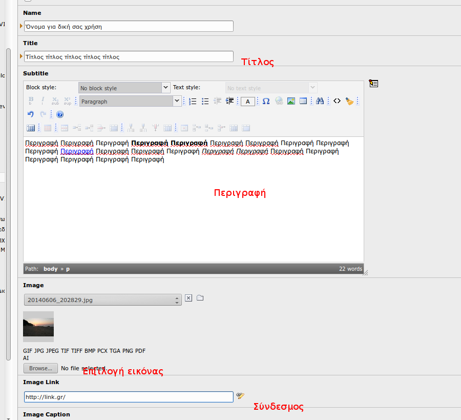 Θα εμφανιστεί μια φόρμα για τα στοιχεία της εικόνας. Η κάθε εικόνα μπορεί να έχει ένα όνομα (δε φαίνεται στο site), έναν τίτλο (φαίνεται με μεγάλα γράμματα στο site) και μια περιγραφή. Η περιγραφή μπορεί να μορφοποιηθεί. Επίσης στο πεδίο "Image Link" μπορείτε να βάλετε έναν σύνδεσμο στον οποίο θα οδηγεί το κλικ της εικόνας. Το πιο σημαντικό είναι το πεδίο "Image" όπου επιλέγετε την εικόνα (βλέπε εικόνα 3).