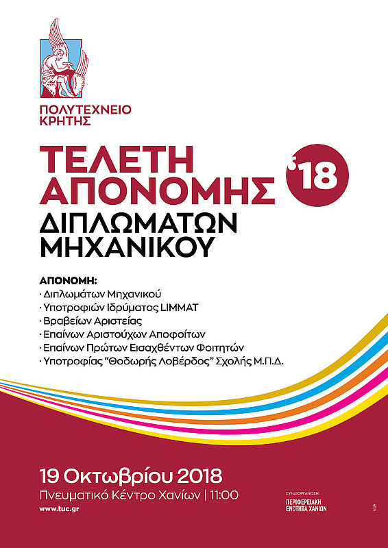 Η Τελετή Απονομής Διπλωμάτων Μηχανικού των Σχολών του Πολυτεχνείου Κρήτης θα πραγματοποιηθεί αύριο, Παρασκευή 19 Οκτωβρίου 2018 και ώρα 11:00, στο Πνευματικό Κέντρο Χανίων.