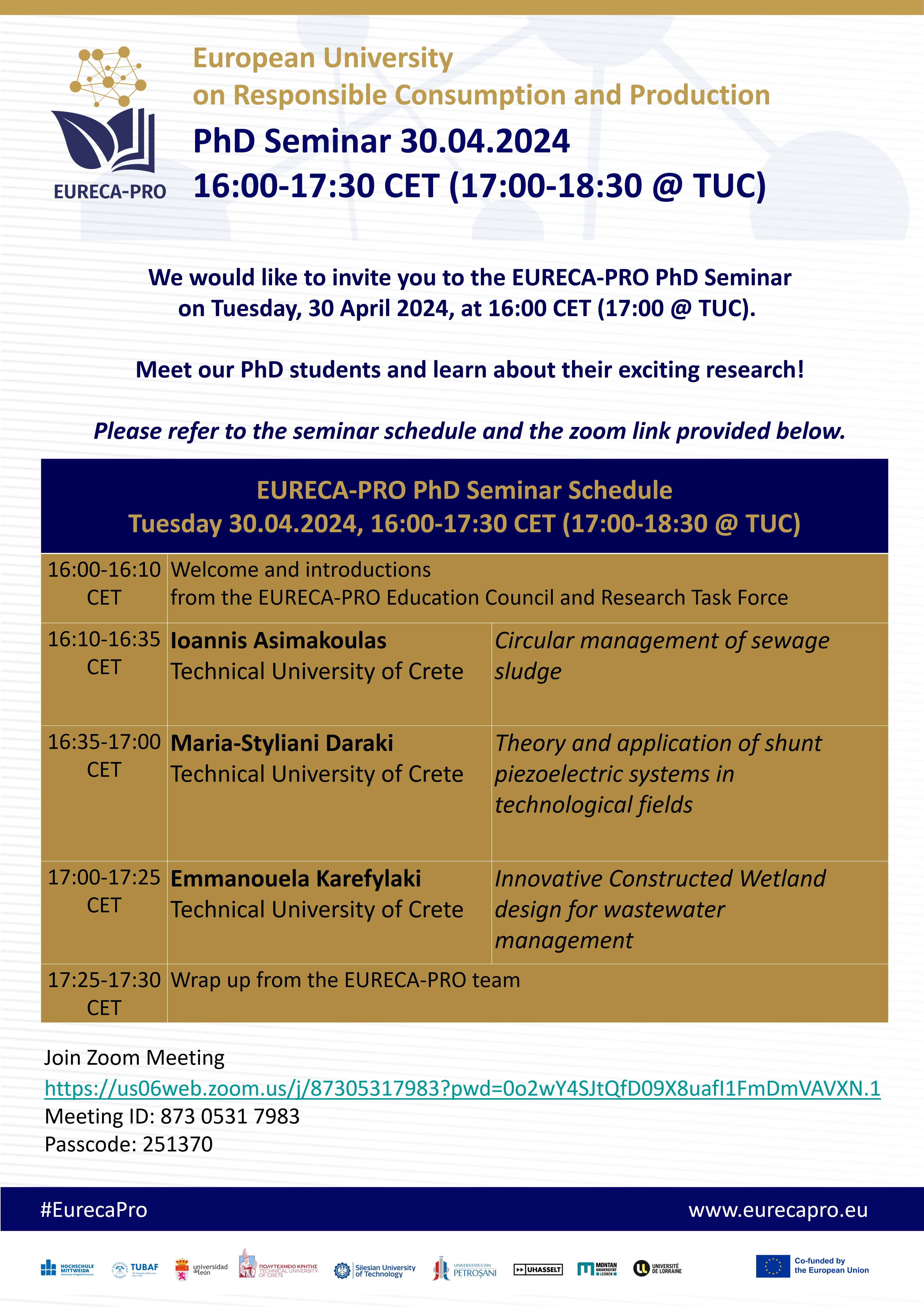 Το Ευρωπαϊκό Πανεπιστήμιο για την Υπεύθυνη Παραγωγή και Κατανάλωση (EURECA-PRO) σας προσκαλεί να παρακολουθήσετε το διαδικτυακό διδακτορικό σεμινάριο που θα πραγματοποιηθεί την Τρίτη 30 Απριλίου 2024, 16:00-17:30 CET (17:00-18:30 @ TUC).