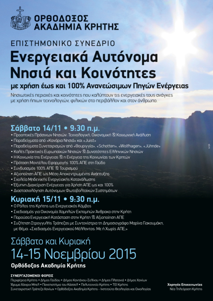 To Πολυτεχνείο Κρήτης συμμετέχει στην υλοποίηση του Διήμερο Επιστημονικού Συνεδρίου που διοργανώνει η Ορθόδοξος Ακαδημία Κρήτης (ΟΑΚ) και το Ινστιτούτο Θεολογίας και Οικολογίας (ΙΘΟ) στις 14 και 15 Νοεμβρίου, αναδεικνύοντας τις Νησιωτικές περιοχές και Κοινότητες, που καλύπτουν τις ενεργειακές τους ανάγκες με αξιοποίηση ήπιων τεχνολογιών φιλικών στο περιβάλλον και τον άνθρωπο.