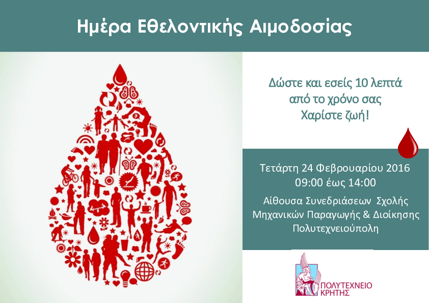Εθελοντική αιμοδοσία από φοιτητές και προσωπικό του Πολυτεχνείου Κρήτης θα πραγματοποιηθεί την Τετάρτη 24 Φεβρουαρίου 2016, από 9.00 πμ έως 2.00 μμ. στην αίθουσα συνεδριάσεων της Σχολής Μηχανικών Παραγωγής & Διοίκησης, στην Πολυτεχνειούπολη.