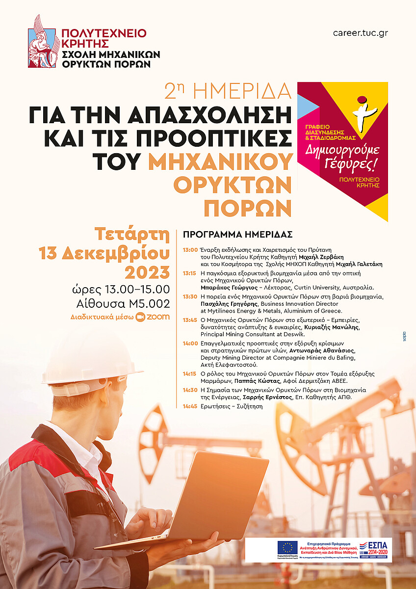 Τo Γραφείο Διασύνδεσης και Σταδιοδρομίας σε συνεργασία με την Σχολή Μηχανικών Ορυκτών Πόρων του Πολυτεχνείου Κρήτης, διοργανώνουν την