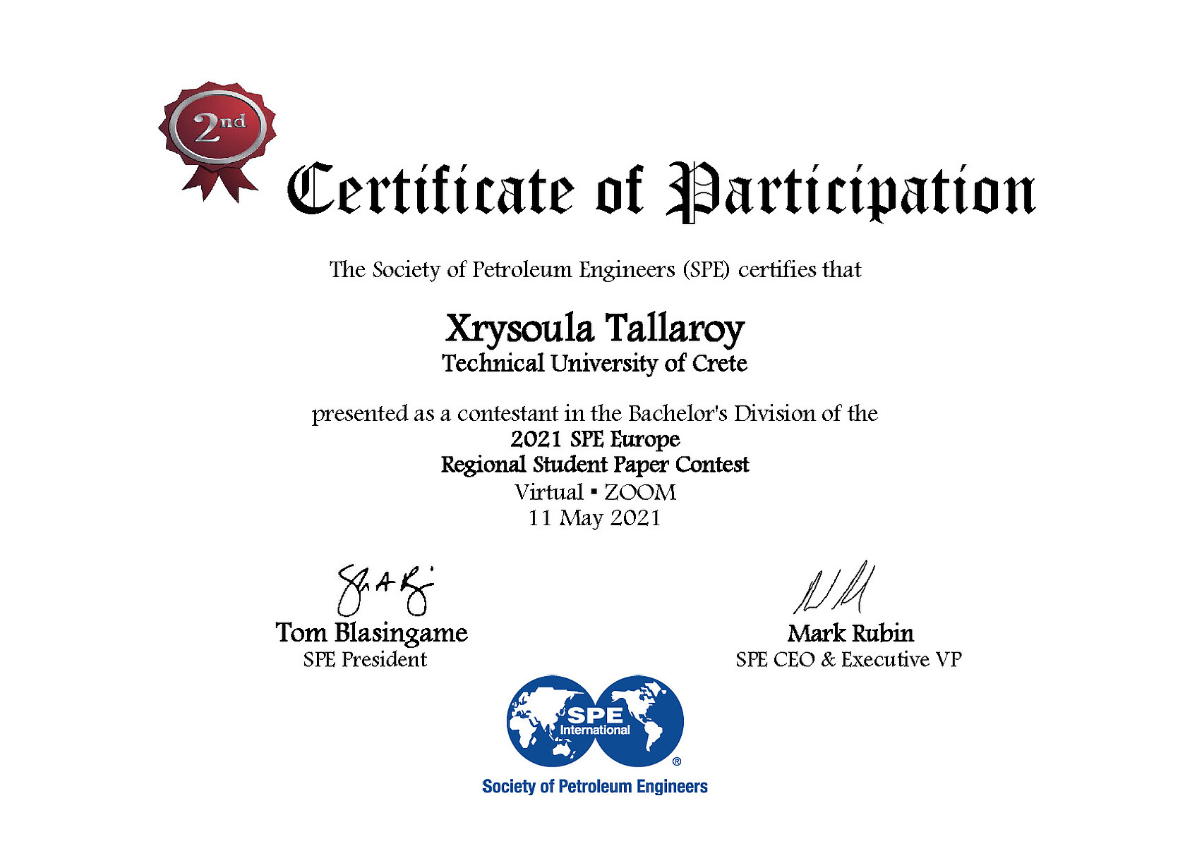Η απόφοιτος της Σχολής Μηχανικών Ορυκτών Πόρων του Πολυτεχνείου Κρήτης Χρυσούλα Τάλλαρου κατέκτησε τη δεύτερη θέση στον Ευρωπαϊκό Διαγωνισμό Bachelor’s Division of the 2021 SPE Europe Regional Paper Contest, της Διεθνούς Κοινότητας Μηχανικών Πετρελαίου (Society of Petroleum Engineers SPE).*