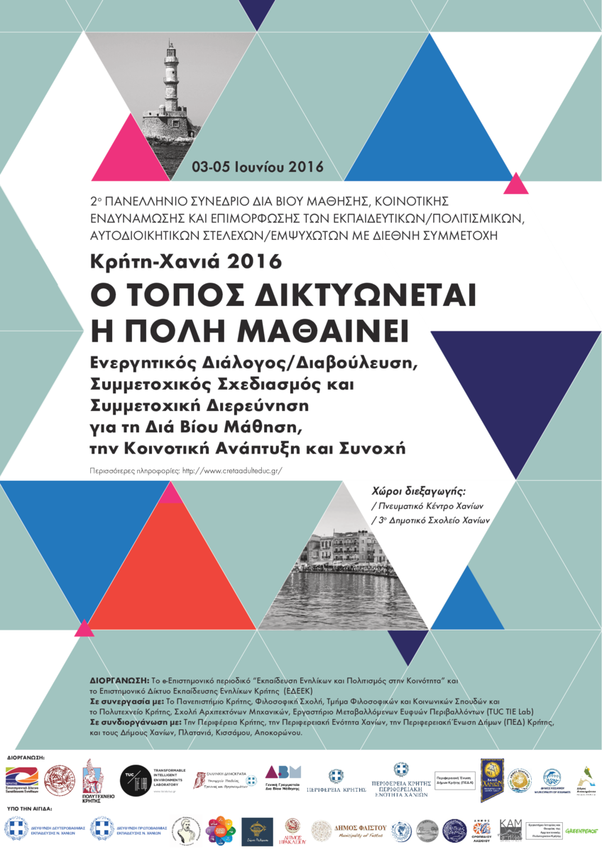 Το δεύτερο Πανελλήνιο Συνέδριο (community based) για την Διά Βίου Μάθηση, την Εκπαίδευση Ενηλίκων και την Επιμόρφωση των Στελεχών (Εκπαιδευτικών, Πολιτισμικών, Αυτοδιοικητικών) με θέμα ‘Κρήτη-Χανιά 2016: Ο ΤΟΠΟΣ ΔΙΚΤΥΩΝΕΤΑΙ Η ΠΟΛΗ ΜΑΘΑΙΝΕΙ’ πραγματοποιήθηκε και φέτος για δεύτερη συνεχή χρονιά από την Παρασκευή 3 Ιουνίου μέχρι και την Κυριακή 5 Ιουνίου 2016 στο Πνευματικό Κέντρο Χανίων και στο 3ο Δημοτικό Σχολείο Χανίων (επί της οδού Κοραή). Το Συνέδριο διοργανώθηκε από το ‘Επιστημονικό Δίκτυο Εκπαίδευσης Ενηλίκων Κρήτης’ και το e-επιστημονικό περιοδικό του ‘Εκπαίδευση Ενηλίκων & Πολιτισμός στην Κοινότητα’ σε συνεργασία με τη ‘Σχολή Αρχιτεκτόνων Μηχανικών του Πολυτεχνείου Κρήτης’, το ‘Τμήμα Φιλοσοφικών και Κοινωνικών Σπουδών του Πανεπιστημίου Κρήτης’ σε συνδιοργάνωση με την Περιφέρεια Κρήτης και την Περιφερειακή Ενότητα Χανίων, την Περιφερειακή Ένωση Δήμων Κρήτης τους Δήμους Χανίων, Πλατανιά, Αποκορώνου, Κισσάμου και πολλούς άλλους Εκπαιδευτικούς, Πολιτισμικούς και Κοινωνικούς Φορείς.