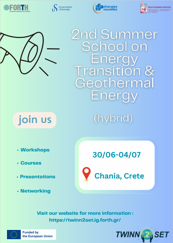 Το Ινστιτούτο Γεωενέργειας του ΙΤΕ σε συνεργασία με το Πολυτεχνείο Κρήτης διοργανώνουν το 2ο Θερινό Σχολείο (2nd Summer School on Energy Transition & Geothermal Energy) στο πλαίσιο του Ευρωπαϊκού Έργου TWINN2SET (Twinning to Sustainable Energy Transition) από 30 Ιουνίου έως 4 Ιουλίου 2025.