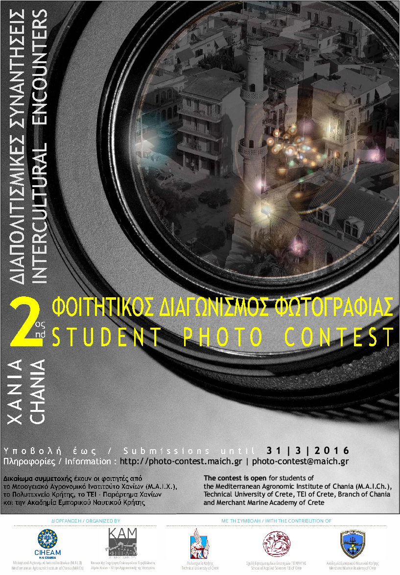 Το Μεσογειακό Αγρονομικό Ινστιτούτου Χανίων (Μ.Α.Ι.Χ.) και το Κέντρο Αρχιτεκτονικής Μεσογείου (ΚΕΠΠΕΔΗΧ-ΚΑΜ), σε συνεργασία με το Πολυτεχνείο Κρήτης, το Τεχνολογικό Εκπαιδευτικό Ίδρυμα Κρήτης – Παράρτημα Χανίων και την Ακαδημία Εμπορικού Ναυτικού Κρήτης (ΑΕΝ Κρήτης) διοργανώνουν το 2ο Φοιτητικό Διαγωνισμό Φωτογραφίας με θέμα «Χανιά - Διαπολιτισμικές Συναντήσεις».