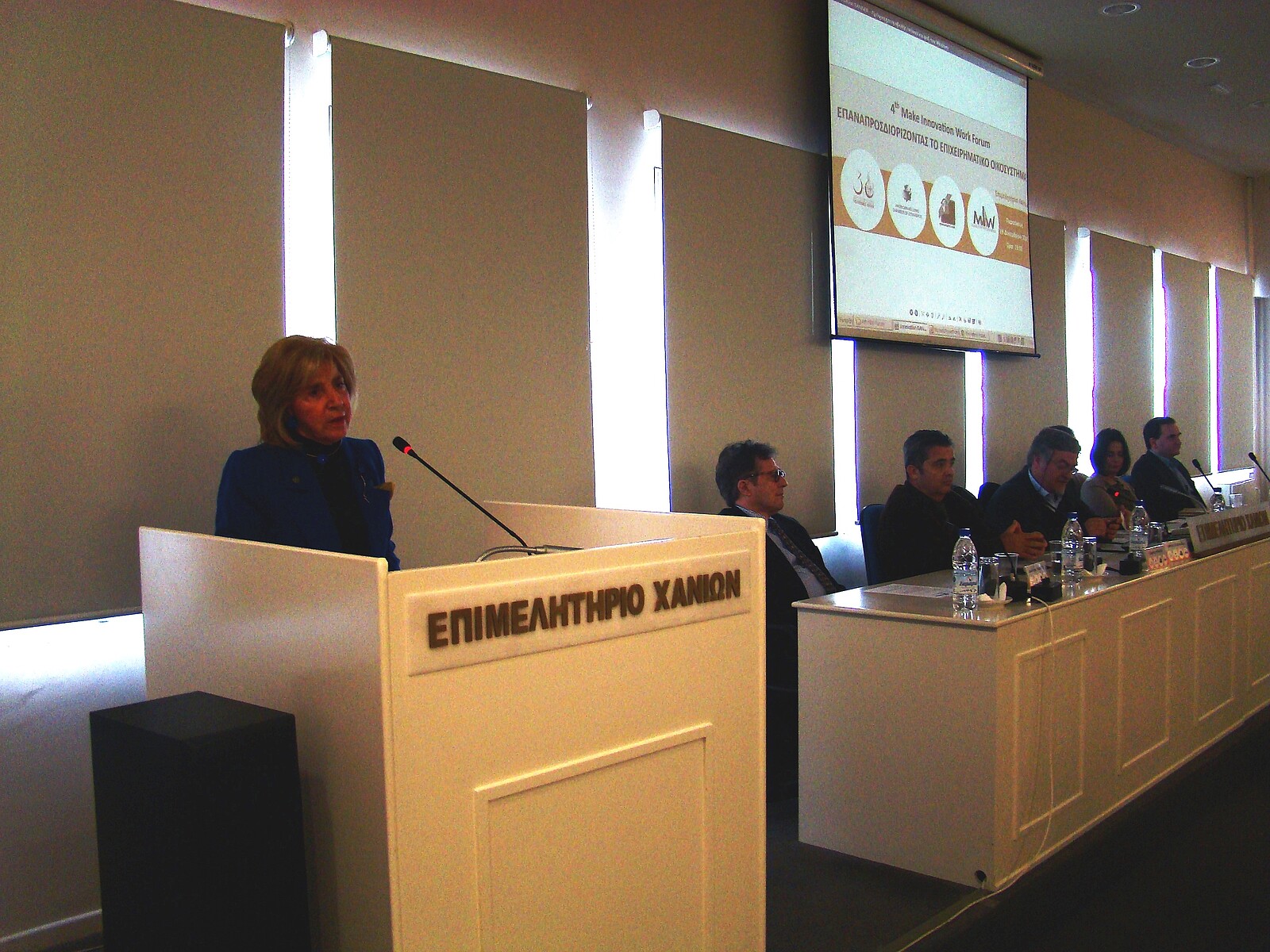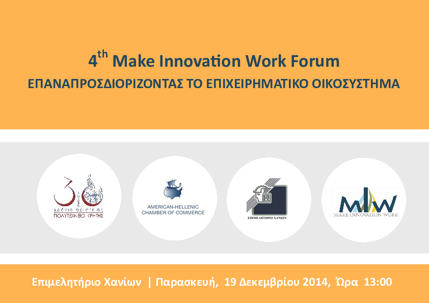 Το Πολυτεχνείο Κρήτης, το Ελληνο-Αμερικανικό Εμπορικό Επιμελητήριο και το Επιμελητήριο Χανίων συνδιοργάνωσαν το «4th Make Innovation Work Forum, ΕΠΑΝΑΠΡΟΣΔΙΟΡΙΖΟΝΤΑΣ ΤΟ ΕΠΙΧΕΙΡΗΜΑΤΙΚΟ ΟΙΚΟΣΥΣΤΗΜΑ», το οποίο πραγματοποιήθηκε την Παρασκευή 19 Δεκεμβρίου 2014 στην αίθουσα συνεδριάσεων του Επιμελητηρίου Χανίων.