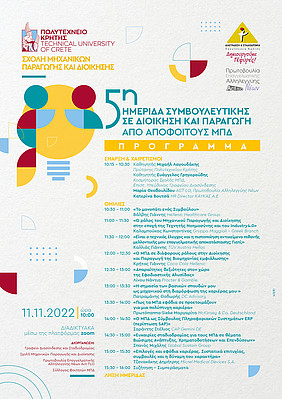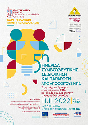 Το Γραφείο Διασύνδεσης και Σταδιοδρομίας σε συνεργασία με την Σχολή Μηχανικών Παραγωγής και Διοίκησης του Πολυτεχνείου Κρήτης, την Πρωτοβουλία Επαγγελματικής Αλληλεγγύης Νέων Act-TLO, και τo Σύλλογο Φοιτητών ΜΠΔ του Ιδρύματος, διοργανώνουν την 5η Ημερίδα Συμβουλευτικής σε Διοίκηση και Παραγωγή από αποφοίτους Μηχανικούς Παραγωγής και Διοίκησης την Παρασκευή 11 Νοεμβρίου 2022 και ώρες 10:00 έως 16:00 διαδικτυακά μέσω zoom.