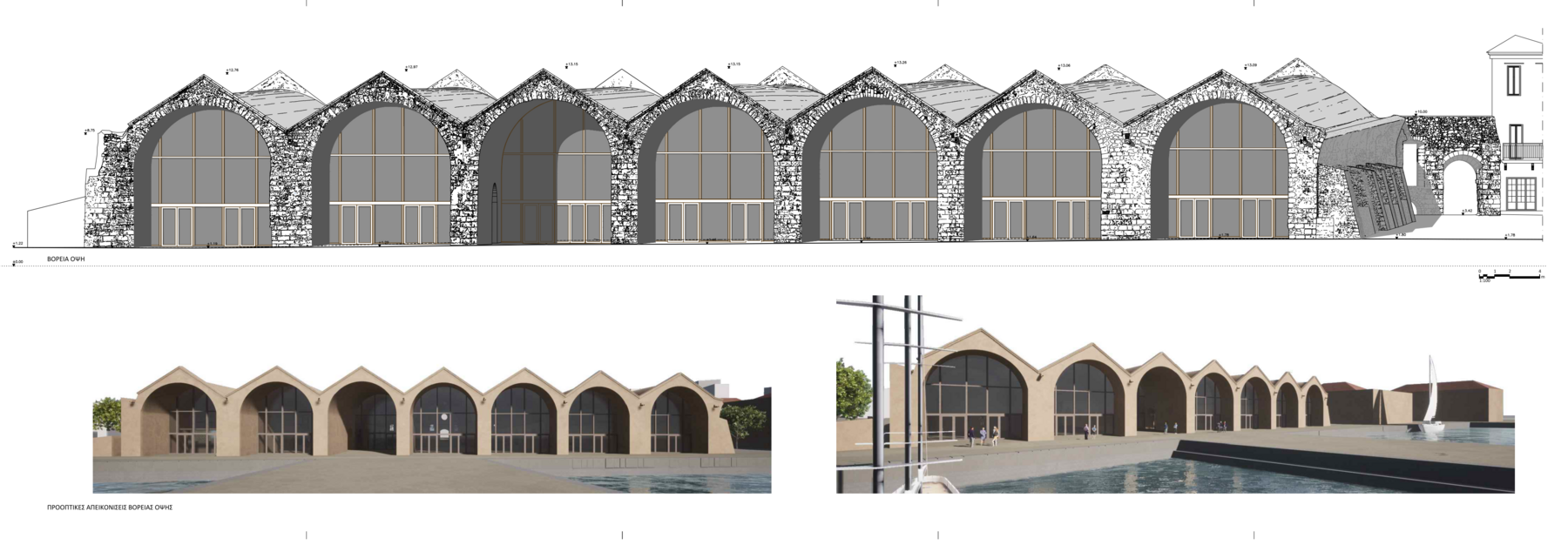 - Η ενότητα των νεωρίων Ν1 έως Ν4 μπορεί να λειτουργήσει ως χώρος περιοδικών εκθέσεων, αλλά και να φιλοξενήσει άλλες εκδηλώσεις. Η είσοδος στον χώρο γίνεται, τόσο από το 5ο νεώριο, όσο και από τα δυτικά, όπου τα τοιχισμένα σήμερα τοξωτά ανοίγματα μπορούν να ανοίξουν και με τον τρόπο αυτόν να τονιστεί η συνέχεια που είχε το συγκρότημα προς τα δυτικά.
