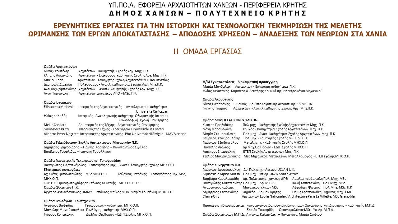 - Μυλωνάς Αντώνιος, Προϊστάμενος του Τμήματος Προγραμματικής Σύμβασης Παλιάς Πόλης Χανίων της Διεύθυνσης Τεχνικών Υπηρεσιών του Δήμου Χανίων