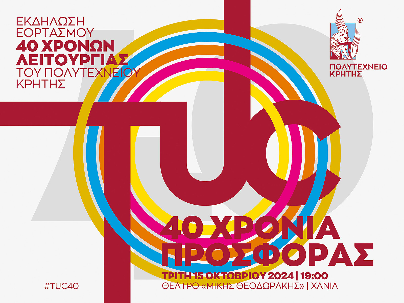 Το Πολυτεχνείο Κρήτης, με αφορμή τη συμπλήρωση των 40 χρόνων λειτουργίας του (1984-2024), διοργανώνει επετειακή εκδήλωση εορτασμού με τίτλο «40 Χρόνια Προσφοράς», την Τρίτη 15 Οκτωβρίου 2024 και ώρα 19:00, στο Θέατρο «Μίκης Θεοδωράκης».