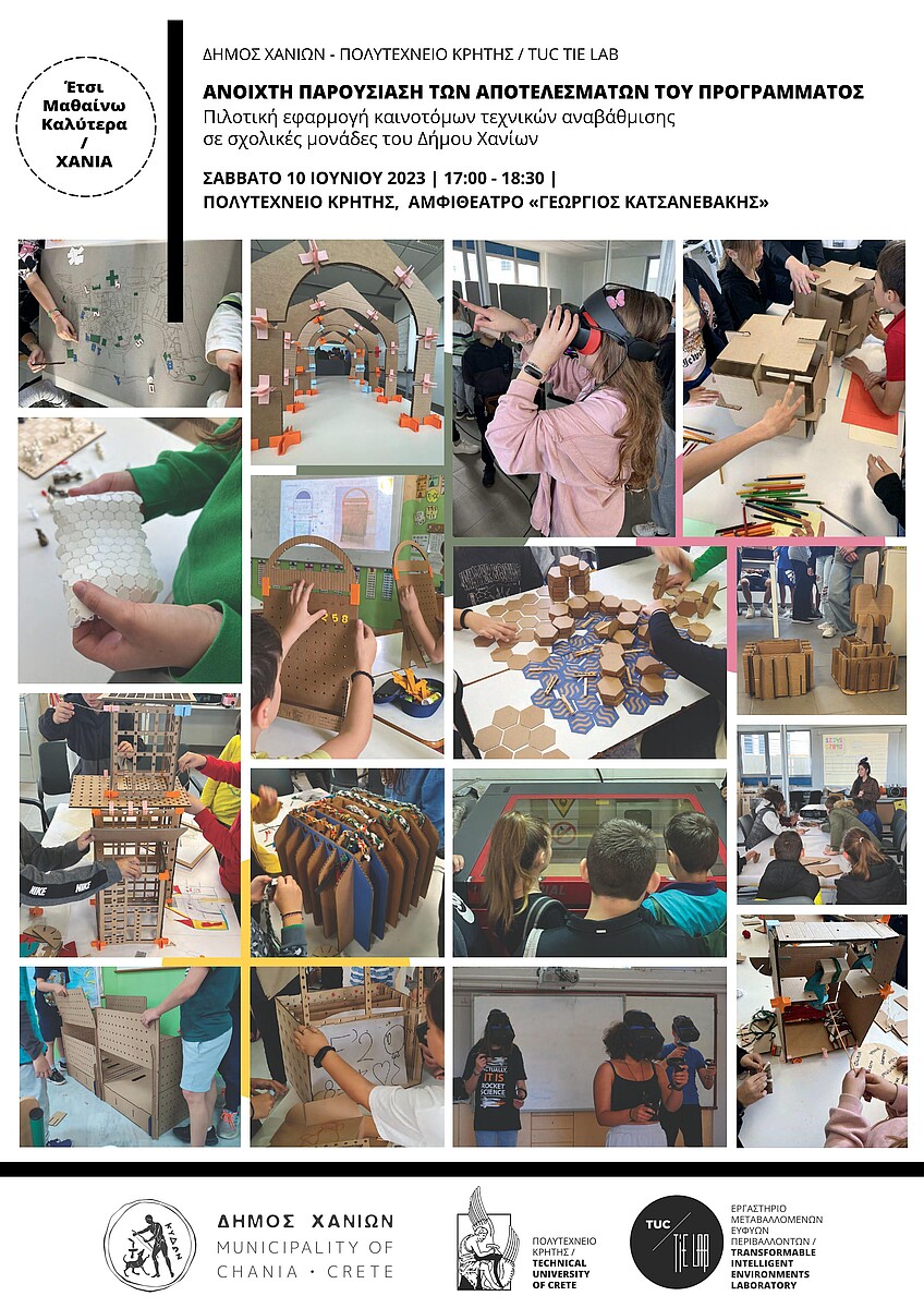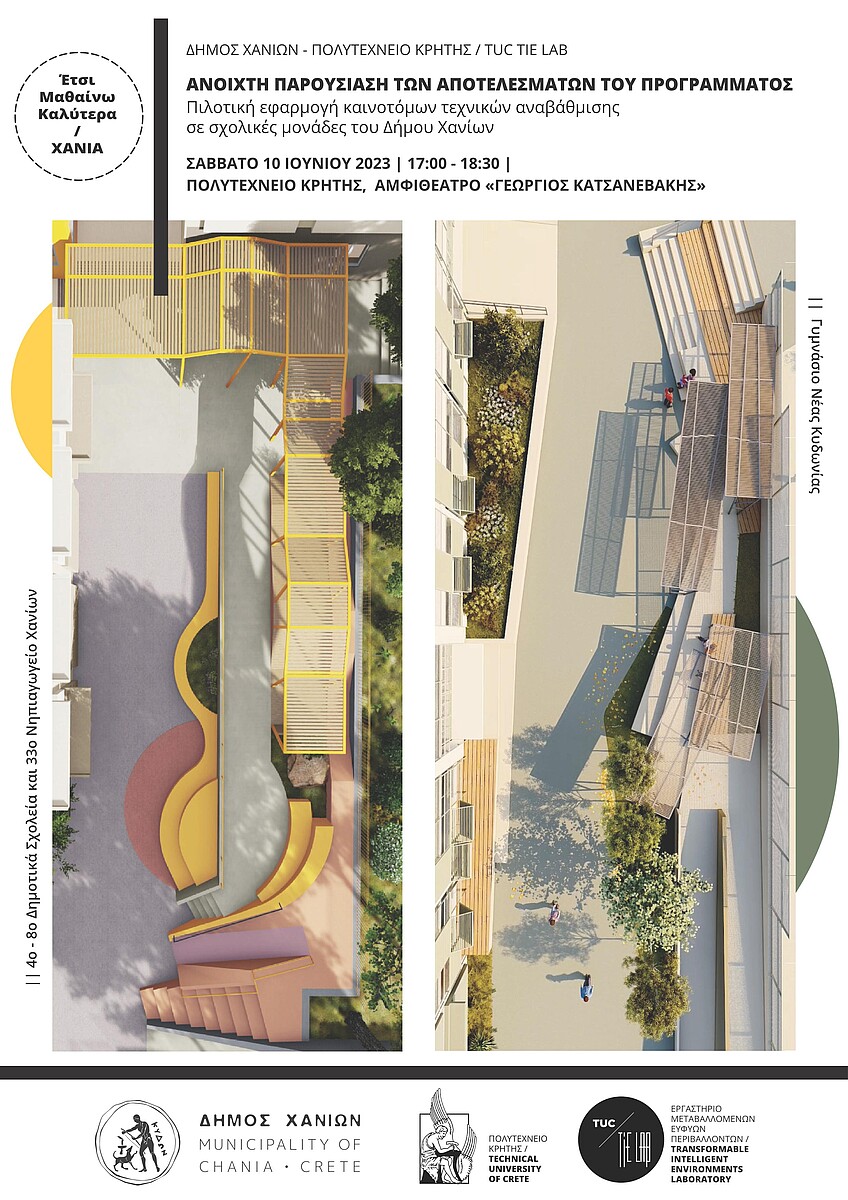 Το Εργαστήριο Transformable Intelligent Environments (TUC TIE Lab) της Σχολής Αρχιτεκτόνων Μηχανικών του Πολυτεχνείου Κρήτης προσκαλεί κάθε ενδιαφερόμενο το Σάββατο 10 Ιουνίου 2023, στις 17:00, στην ανοιχτή παρουσίαση των αποτελεσμάτων του Προγράμματος «Πιλοτική εφαρμογή καινοτόμων τεχνικών αναβάθμισης σε σχολικές μονάδες του Δήμου Χανίων». Η εκδήλωση θα πραγματοποιηθεί στην Πολυτεχνειούπολη, στο Αμφιθέατρο «Γεώργιος Κατσανεβάκης» (Γ2.2).