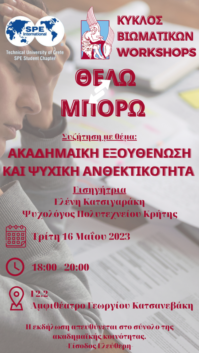 Ο κύκλος των βιωματικών εργαστηρίων καλλιέργειας εργασιακών δεξιοτήτων με γενικό τίτλο «ΘΕΛΩ.ΜΠΟΡΩ» που συνδιοργανώνει το Φοιτητικό Παράρτημα της Society of Petroleum Engineers (SPE) με τη Σύμβουλο Σταδιοδρομίας του Προγράμματος Κοινωνικής Μέριμνας Φοιτητών του Πολυτεχνείου Κρήτης, κα. Ιωάννα Κοκολαντωνάκη, ολοκληρώνεται με μία ανοικτή συζήτηση γύρω από το θέμα
