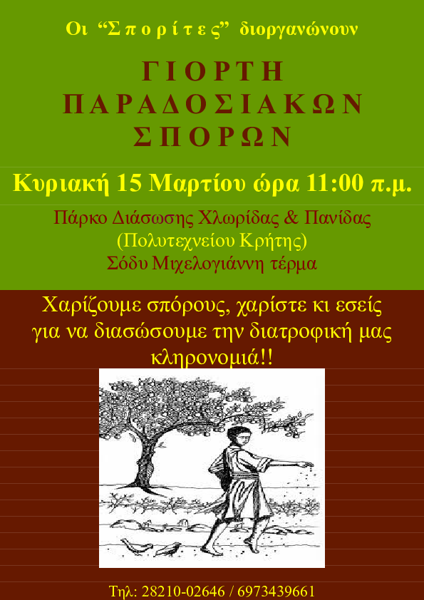 Η ομάδα των Σποριτών διοργανώνει και φέτος, την ανοιξιάτικη γιορτή παραδοσιακών σπόρων, στο Πάρκο Διάσωσης Χλωρίδας και Πανίδας του Πολυτεχνείου Κρήτης, την Κυριακή 15 Μαρτίου, στις 11.00 το πρωί. Την εκδήλωση θα παρουσιάσει ο βιοκαλλιεργητής Δημήτρης Παυλάκης, και θα μιλήσουν, το μέλος των Σποριτών, Μαλάμω Μηλογιαννάκη και ο γεωπόνος, ειδικός στα ντόπια αρωματικά φυτά, Κώστας Οικονομάκης.