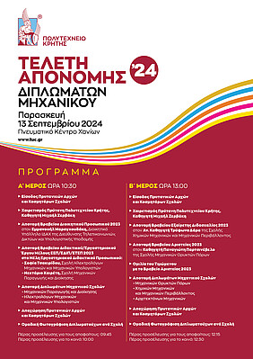 Τα Βραβεία θα απονεμηθούν κατά τη διάρκεια της Τελετής Απονομής Διπλωμάτων Μηχανικού του Πολυτεχνείου Κρήτης για την ανακήρυξη της εξεταστικής του Εαρινού Εξαμήνου 2023-2024.