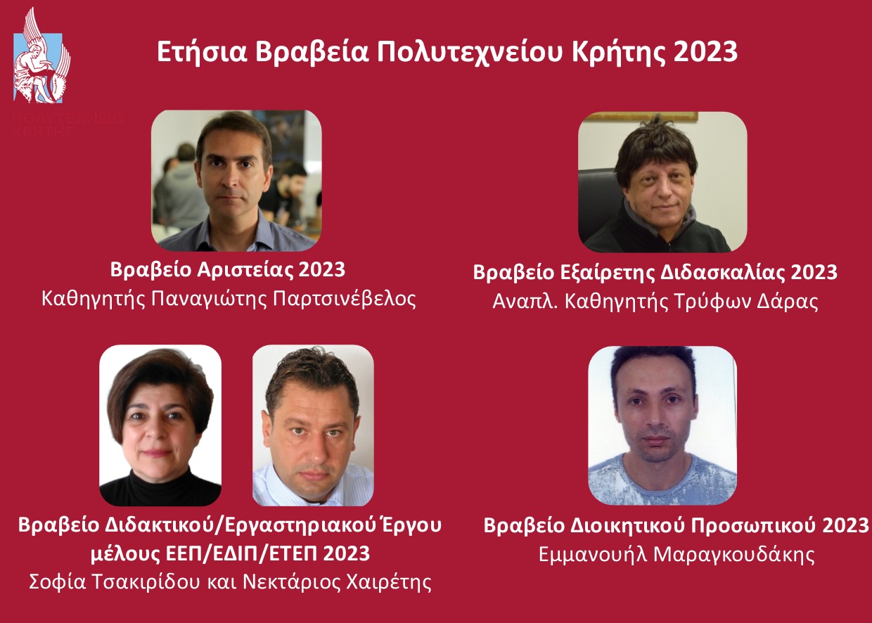 Τα Βραβεία, τα οποία θα απονεμηθούν σε μέλη του Πολυτεχνείου Κρήτης για τα επιτεύγματά τους κατά το έτος 2023, είναι: