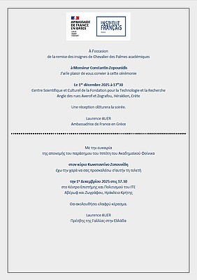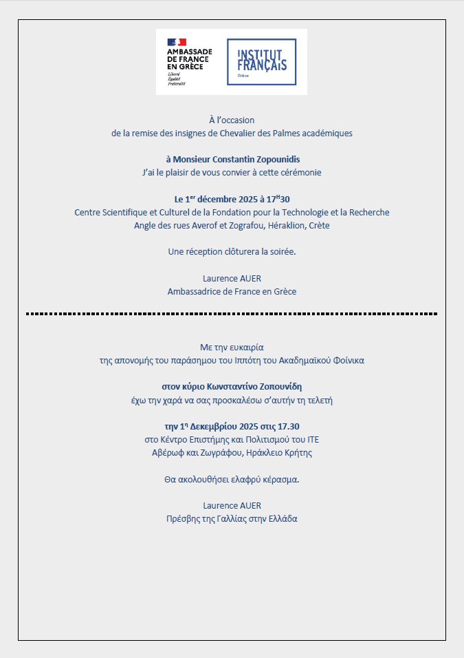 Η Τελετή Παρασημοφόρησης του Καθηγητή Κωνσταντίνου Ζοπουνίδη της Σχολής Μηχανικών Παραγωγής και Διοίκησης του Πολυτεχνείου Κρήτης με το Παράσημο του Ιππότη του Τάγματος του Ακαδημαϊκού Φοίνικα από τη Γαλλική Δημοκρατία για το έργο του στη Χρηματοοικονομική Διοίκηση και το Μάνατζμεντ, θα λάβει χώρα τη Δευτέρα 1 Δεκεμβρίου 2025 και ώρα 17.30, στο Κέντρο Επιστήμης και Πολιτισμού του ΙΤΕ (Αβέρωφ και Ζωγράφου) στο Ηράκλειο Κρήτης.