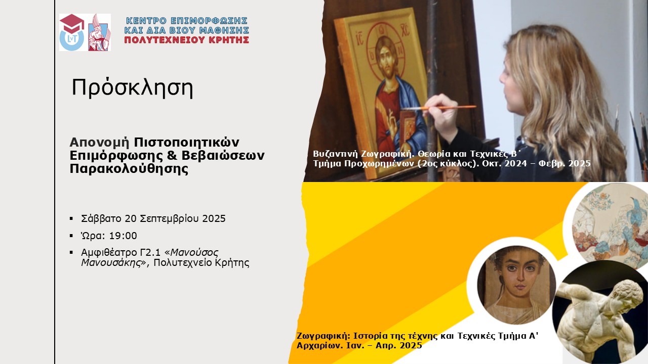 Το Κέντρο Διά Βίου Μάθησης (ΚΕΔΙΒΙΜ) του Πολυτεχνείου Κρήτης (ΠΚ) διοργανώνει την Τελετή Απονομής Πιστοποιητικών Επιμόρφωσης και Βεβαιώσεων Παρακολούθησης στους εκπαιδευόμενους των Προγραμμάτων «Βυζαντινή ζωγραφική. Θεωρία και Τεχνικές. Τμήμα Προχωρημένων» και «Ζωγραφική: Ιστορία της τέχνης και Τεχνικές. Τμήμα Αρχαρίων», το Σάββατο 20 Σεπτεμβρίου 2025 και ώρα 19:00, στο Αμφιθέατρο «Μανούσος Μανουσάκης» (Γ2.1) της Πολυτεχνειούπολης.