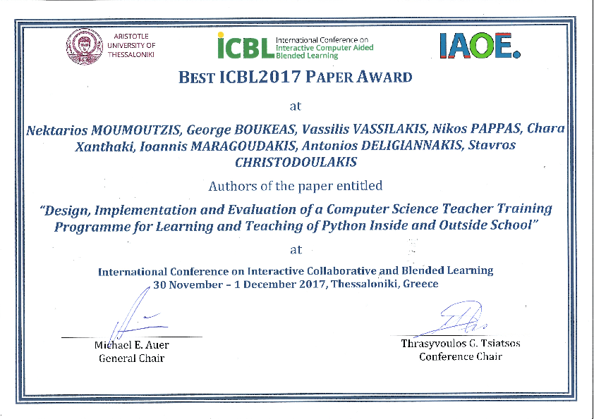 Μέλη της ερευνητικής ομάδας του Εργαστηρίου Διανεμημένων Πληροφορικών Συστημάτων και Εφαρμογών της Σχολής Ηλεκτρολόγων Μηχανικών & Μηχανικών Υπολογιστών του Πολυτεχνείου Κρήτης, και ειδικότερα οι κ.κ. Ν. Μουμουτζής, Ν. Παππάς, Ι. Μαραγκουδάκης, Α. Δεληγιαννάκης, και Σ. Χριστοδουλάκης, σε συνεργασία με τους Καθηγητές Πληροφορικής Δευτεροβάθμιας Εκπαίδευσης Γ. Μπουκέα, Β. Βασιλάκη και Χ. Ξανθάκη, έλαβαν το βραβείο Best ICBL 2017 Paper Award στα πλαίσια του Συνεδρίου ICBL2017 – International Conference on Interactive Collaborative and Blended Learning, 2017, Thessaloniki, για την ερευνητική εργασία τους με τίτλο: 'Design, Implementation and Evaluation of a Computer Science Teacher Training Programme for Learning and Teaching of Python Inside and Outside School', Nektarios Moumoutzis, George Boukeas, Vassilis Vassilakis, Nikos Pappas, Chara Xanthaki, Ioannis Maragoudakis, Antonios Deligiannakis, Stavros Christodoulakis.