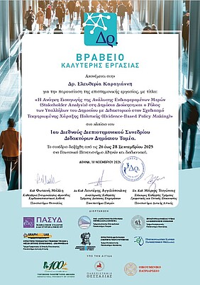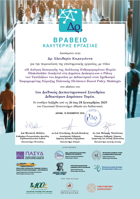 Το Βραβείο Καλύτερης Εργασίας στο 1ο Διεθνές Διεπιστημονικό Συνέδριο Διδακτόρων Δημοσίου Τομέα απονεμήθηκε στην Προϊσταμένη της Μονάδας Στρατηγικού Σχεδιασμού του Πολυτεχνείου Κρήτης, Δρ. Ελευθερία Καραγιάννη, για την εργασία της με τίτλο: «Η Ανάγκη Εισαγωγής της Ανάλυσης Ενδιαφερόμενων Μερών (Stakeholder Analysis) στη Δημόσια Διοίκηση και ο Ρόλος των Υπαλλήλων του Δημοσίου με Διδακτορικό στον Σχεδιασμό Τεκμηριωμένης Χάραξης Πολιτικής (Evidence-Based Policy Making)».