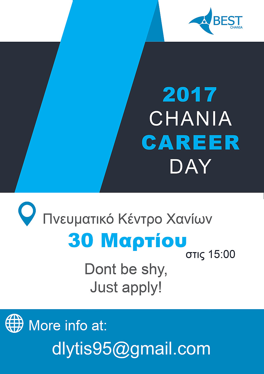 O φοιτητικός σύλλογος BEST Chania του Πολυτεχνείου Κρήτης, διοργανώνει φέτος το Chania Career Day στις 30 Μαρτίου 2017 και ώρα 15:00 στο Πνευματικό Κέντρο Χανίων. Η διοργάνωση, γίνεται στα πλαίσια της συνδιάσκεψης φοιτητών μηχανικών ανατολικής Μεσογείου, που διοργανώνει φέτος το τοπικό γραφείο BEST του Πολυτεχνείου Κρήτης. Η πρώτη μέρα αυτής της διοργάνωσης Chania Career Day είναι αφιερωμένη στους φοιτητές του Πολυτεχνείου Κρήτης καθώς επίσης και στους συνεργάτες του συλλόγου οι οποίοι βρίσκουν την ευκαιρία να αλληλεπιδράσουν με αυτούς. Η εκδήλωση είναι ανοιχτή σε όλους τους φοιτητές μηχανικούς των Χανίων.