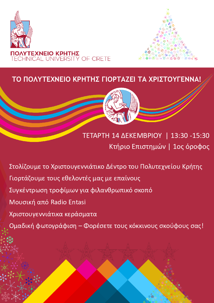 To Πολυτεχνείο Κρήτης γιορτάζει τα Χριστούγεννα! Με μεγάλη μας χαρά, σας προσκαλούμε στη χριστουγεννιάτικη γιορτή του Πολυτεχνείου Κρήτης, την Τετάρτη 14 Δεκεμβρίου και ώρες 13:30-15:30, στον χώρο έξω από το μεγάλο αμφιθέατρο 141.Π.98, στον 1ο όροφο του Κτηρίου Επιστημών!
