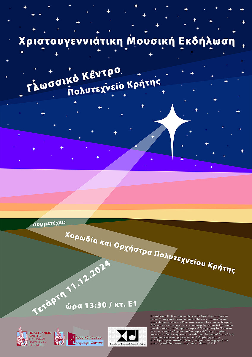 The Language Centre of the Technical University of Crete invites all TUC members to the Christmas Music Event it organizes on Wednesday, December 11, 2024 at 1:30 p.m. in the main hall of the Language Centre, in Building E1, on the 1st floor. The student group "Choir and Orchestra of the Technical University of Crete" will participate in the event.