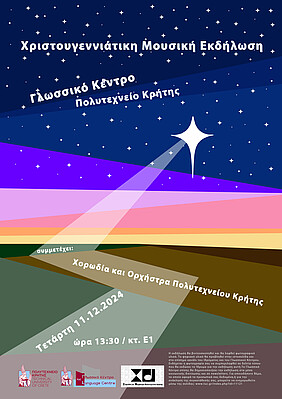 Το Γλωσσικό Κέντρο του Πολυτεχνείου Κρήτης σας προσκαλεί στην Χριστουγεννιάτικη Μουσική Εκδήλωση που διοργανώνει την Τετάρτη 11 Δεκεμβρίου 2024 και ώρα 13:30 στην κεντρική αίθουσα του Γλωσσικού Κέντρου, στο Κτήριο Ε1, στον 1ο όροφο. Στην εκδήλωση θα συμμετέχει η φοιτητική ομάδα «Χορωδία και Ορχήστρα Πολυτεχνείου Κρήτης».