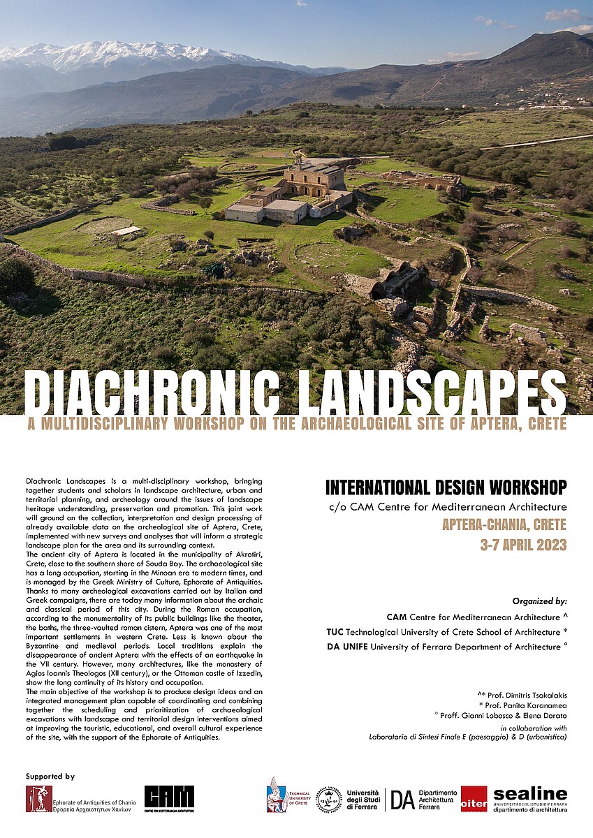 Το διεπιστημονικό εκπαιδευτικό εργαστήριο «Διαχρονικά Τοπία» αφορά θέματα τοπιακής κληρονομιάς και πολιτισμικού τοπίου ανάμεσα στην αρχιτεκτονική, την αρχιτεκτονική τοπίου, τον αστικό και πολεοδομικό σχεδιασμό και την αρχαιολογία. Θα πραγματοποιηθεί ανάμεσα σε φοιτητές/φοιτήτριες και διδάσκοντες/διδάσκουσες της Σχολής Αρχιτεκτόνων Μηχανικών του Πολυτεχνείου Κρήτης και της Αρχιτεκτονικής Σχολής του Πανεπιστημίου της Ferrara στην Ιταλία. Το εργαστήριο θα θίξει θέματα κατανόησης και ερμηνείας, προστασίας, ανάδειξης και σχεδιασμού της αρχαιολογικής τοποθεσίας της Αρχαίας Απτέρας Χανίων. Η αρχαία πόλη της Απτέρας βρίσκεται στην Περιφερειακή Ενότητα Χανίων στην Κρήτη, κοντά στο λιμάνι της Σούδας. Η ανθρωπογενής δράση στην περιοχή είχε ήδη εμφανιστεί από τη Μινωική εποχή και συνεχίζεται έως σήμερα.