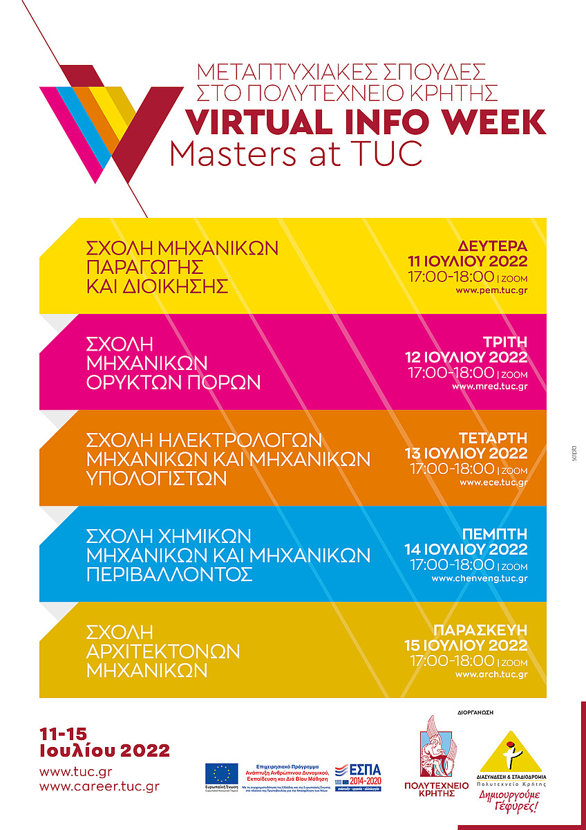 Το Γραφείο Διασύνδεσης και Σταδιοδρομίας του Πολυτεχνείου Κρήτης, στο πλαίσιο των δράσεων του, διοργανώνει Εβδομάδα Διαδικτυακών Παρουσιάσεων "Virtual Info Week Masters at TUC" για τα Προγράμματα Μεταπτυχιακών Σπουδών (ΠΜΣ) στο Πολυτεχνείο Κρήτης σε συνεργασία με τις πέντε Σχολές του Ιδρύματος. Οι παρουσιάσεις θα διεξαχθούν από 11 έως 15 Ιουλίου 2022 και ώρα 17:00-18:00 μέσω της πλατφόρμας τηλεδιασκέψεων ZOOM.