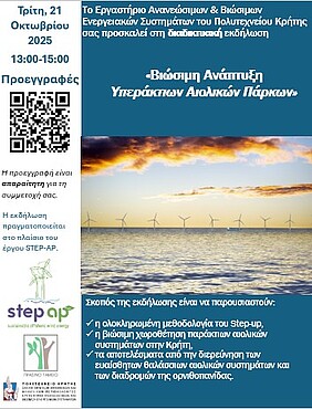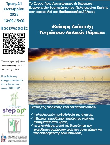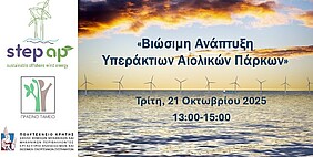 Το ερευνητικό έργο «Βιώσιμη χωροθέτηση υπεράκτιων αιολικών πάρκων. Εφαρμογή στην Κρήτη (SusTainablE siting of offshore wind Parks. APplication in Crete) Step – Ap», που χρηματοδοτείται από το Πρόγραμμα «ΦΥΣΙΚΟ ΠΕΡΙΒΑΛΛΟΝ & ΚΑΙΝΟΤΟΜΕΣ ΔΡΑΣΕΙΣ 2023» υπό τον άξονα προτεραιότητας 3 «ΕΡΕΥΝΑ ΚΑΙ ΕΦΑΡΜΟΓΗ» του Πράσινου Ταμείου, στοχεύει στη μελέτη για βέλτιστη χωροθέτηση των υπεράκτιων αιολικών πάρκων στην Κρήτη.