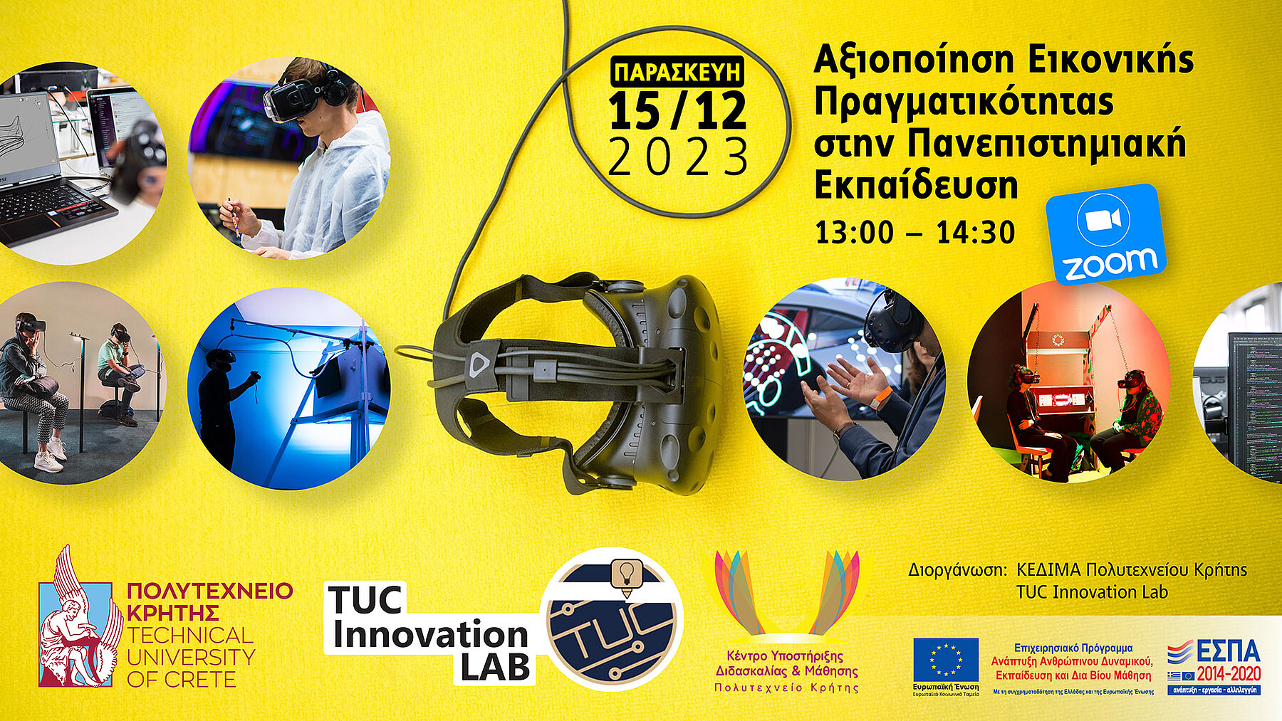 Το Κέντρο Υποστήριξης Διδασκαλίας & Μάθησης (ΚΕ.ΔΙ.ΜΑ.)* και η ομάδα του TUC Innovation Lab** του Πολυτεχνείου Κρήτης διοργανώνουν Διαδικτυακή Ημερίδα την Παρασκευή 15 Δεκεμβρίου 2023 στις 13:00–14:30 με τίτλο: