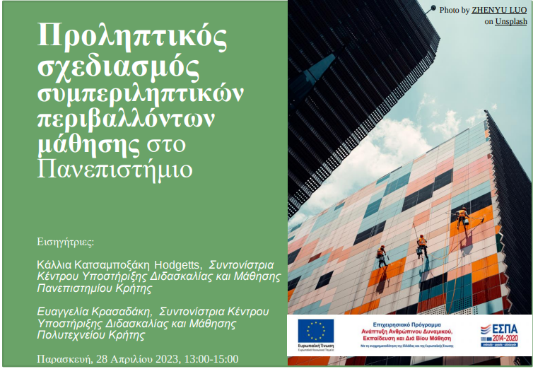 Στο πλαίσιο του Μνημονίου Συνεργασίας και Συναντίληψης που έχουν συνυπογράψει το Πολυτεχνείο Κρήτης με το Πανεπιστήμιο Κρήτης για την υποστήριξη της διδασκαλίας και μάθησης, τα Κέντρα Υποστήριξης Διδασκαλίας και Μάθησης (ΚΕΔΙΜ) του Πανεπιστημίου Κρήτης και του Πολυτεχνείου Κρήτης συνδιοργανώνουν διαδικτυακή ημερίδα με θέμα τα συμπεριληπτικά περιβάλλοντα μάθησης και τις προληπτικές ενέργειες σχεδιασμού που μπορούν να τα καταστήσουν αποτελεσματικά. Η ημερίδα απευθύνεται σε διδάσκοντες/ουσες της τριτοβάθμιας εκπαίδευσης που επιθυμούν να εντοπίσουν πιθανούς μαθησιακούς φραγμούς και να εντάξουν στο μάθημά τους συμπεριληπτικές στρατηγικές που δίνουν ευκαιρίες πρόσβασης, συμμετοχής και επίτευξης ακαδημαϊκών στόχων σε όλους τους φοιτητές και τις φοιτήτριες.