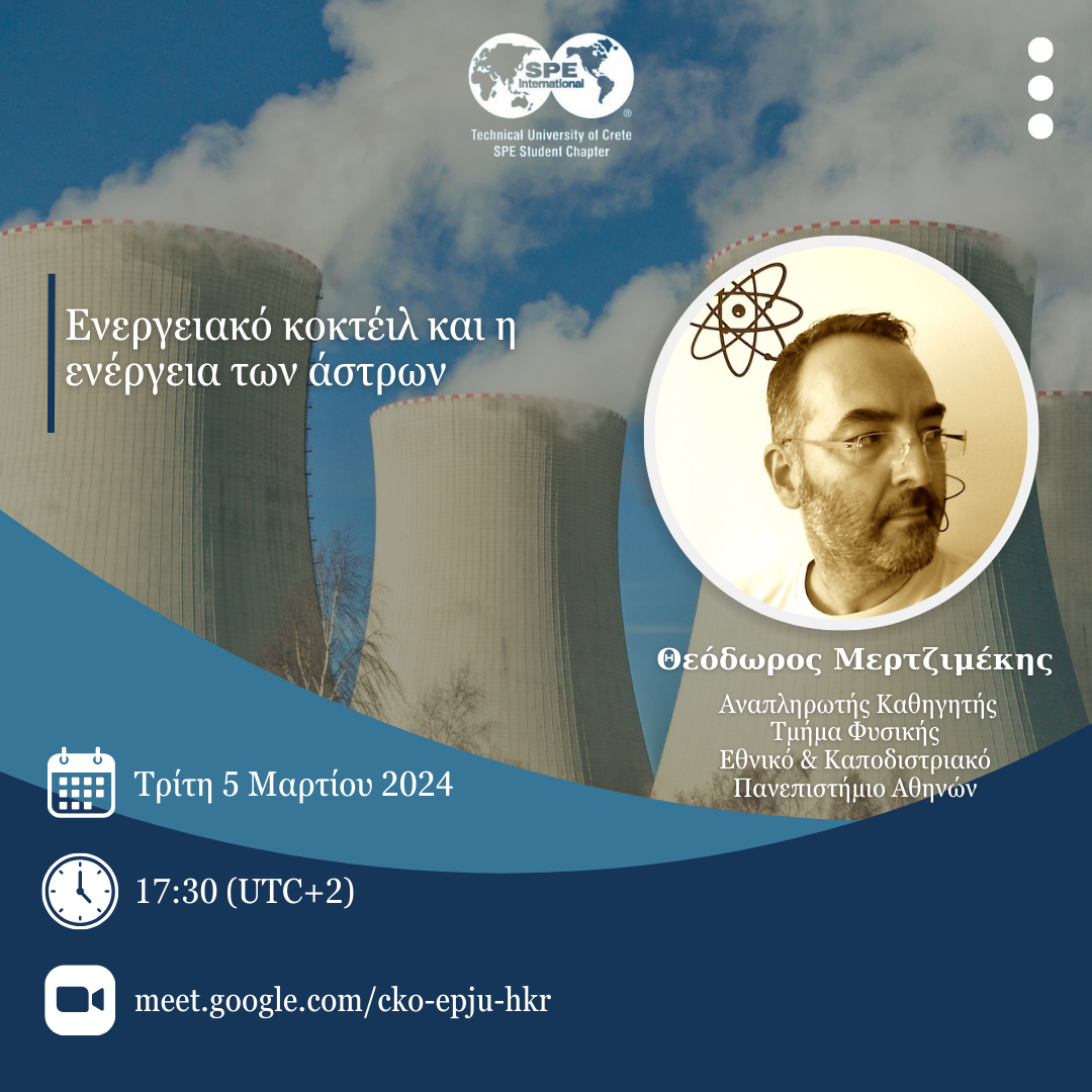 To Φοιτητικό Παράρτημα SPE του Πολυτεχνείου Κρήτης σας προσκαλεί στην ομιλία τoυ Αναπληρωτή Καθηγητή Θεόδωρου Μερτζιμέκη του Τμήματος Φυσικής του Εθνικού και Καποδιστριακού Πανεπιστημίου Αθηνών. Το θέμα της ομιλίας είναι "Ενεργειακό κοκτέιλ και η ενέργεια των άστρων". Η ομιλία θα διεξαχθεί διαδικτυακά την Τρίτη 5 Μαρτίου 2024 και ώρα 17:30 EET (UTC+2).
