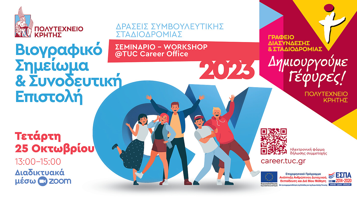 Το Γραφείο Διασύνδεσης και Σταδιοδρομίας (ΓΔΣ) του Πολυτεχνείου Κρήτης στο πλαίσιο της δράσης Εξειδικευμένος Επαγγελματικός Προσανατολισμός, διοργανώνει διαδικτυακό σεμινάριο-workshop, με τίτλο «Βιογραφικό Σημείωμα - Συνοδευτική Επιστολή» για τους φοιτητές και αποφοίτους του Ιδρύματος, με στόχο τη βελτίωση και ανάπτυξη εργασιακών δεξιοτήτων κατά την είσοδό τους στην αγορά εργασίας.